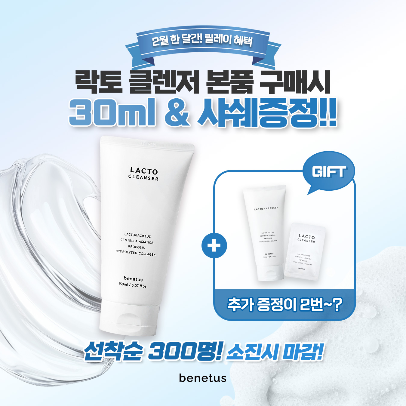 정제수, 소듐C14-16올레핀설포네이트, 코코-베타인, 부틸렌글라이콜, 메틸퍼플루오로아이소부틸에터, 라우라마이드디이에이, 아크릴레이트코폴리머, 소듐클로라이드, 1,2-헥산다이올, 락토바실러스발효물(9,750ppm), 모란뿌리추출물, 약모밀추출물, 병풀추출물, 프로폴리스추출물, 편백수, 스타아니스추출물, 쇠비름추출물, 마트리카리아추출물, 녹차추출물, 하이드롤라이즈드콜라겐, 소듐하이알루로네이트, 판테놀, 알란토인, 글리세린, 아이소펜틸다이올, 에틸헥실글리세린, 아크릴레이트/C10-30알킬아크릴레이트크로스폴리머, 잔탄검, 하이드록시아세토페논, 소듐하이드록사이드, 폴리쿼터늄-7, 다이소듐이디티에이, 소듐벤조에이트